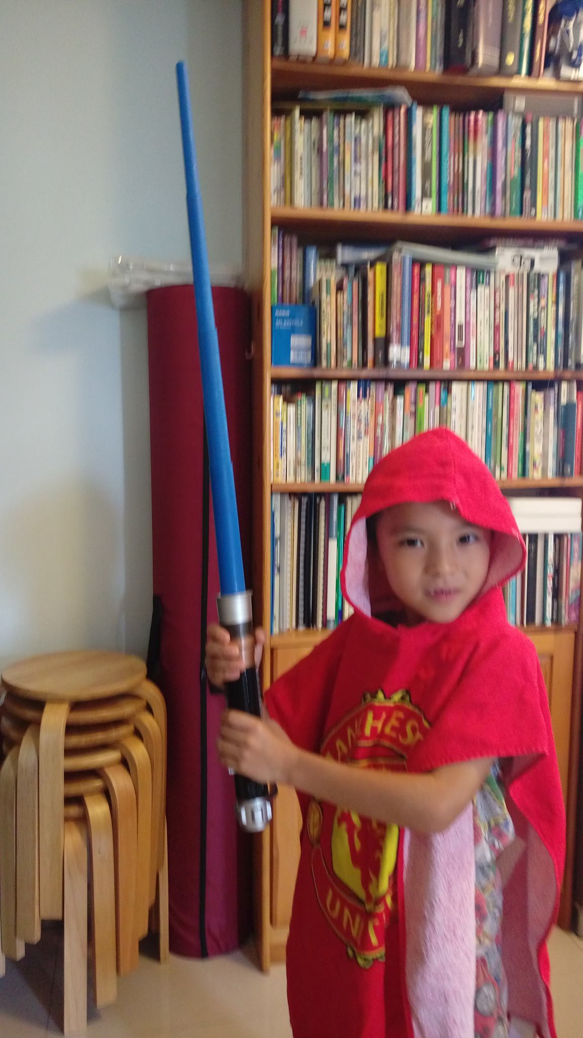 兩父子一人一劍之後還有甚麼做?那還用問?當然就立刻拿劍出來拼個你死我活啦!如今和先前不同了,兒子拿著「絕地武士激光劍」之際,為求增加真實感,就連浴袍也要充作武士長袍,實在認真非常!不過這時候最失落的,可能就是太太了。由於我們一人是Anakin,另一人是Obi Wan,那總要有位奸角與我們戰鬥嘛!於是太太就被選上成為Sith了!不過她也十分投入,以一敵二而毫無懼色,母愛實在偉大呢!